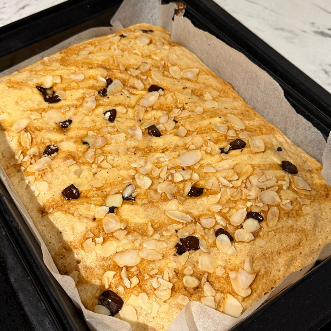 Tumeda šokolaadi tükkidega, mandlilaastudega kohupiimakook