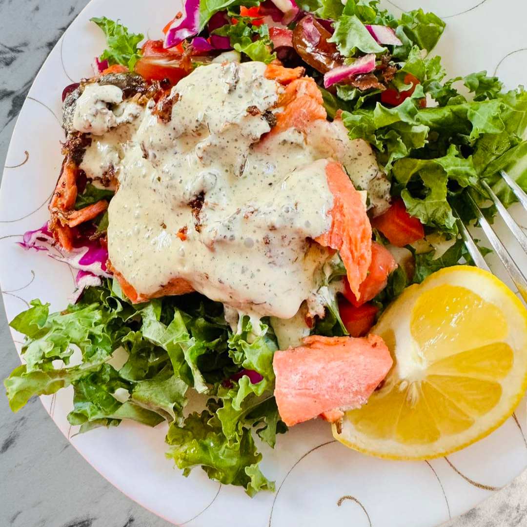 Kartulinuudlid kana ja avokaado-tomatisalatiga