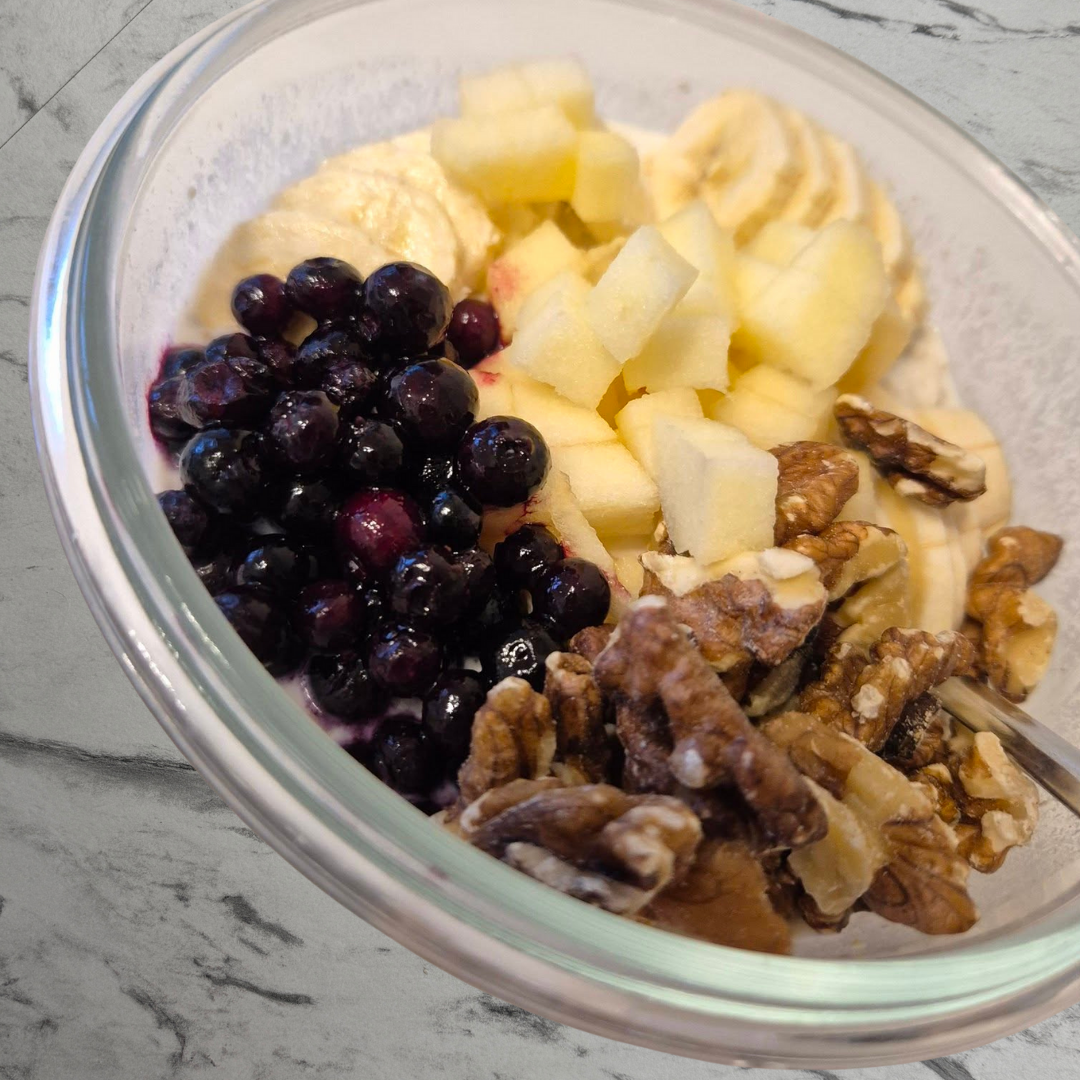 Sojajogurt marjadega, puuviljaga ja Kreeka pähklitega